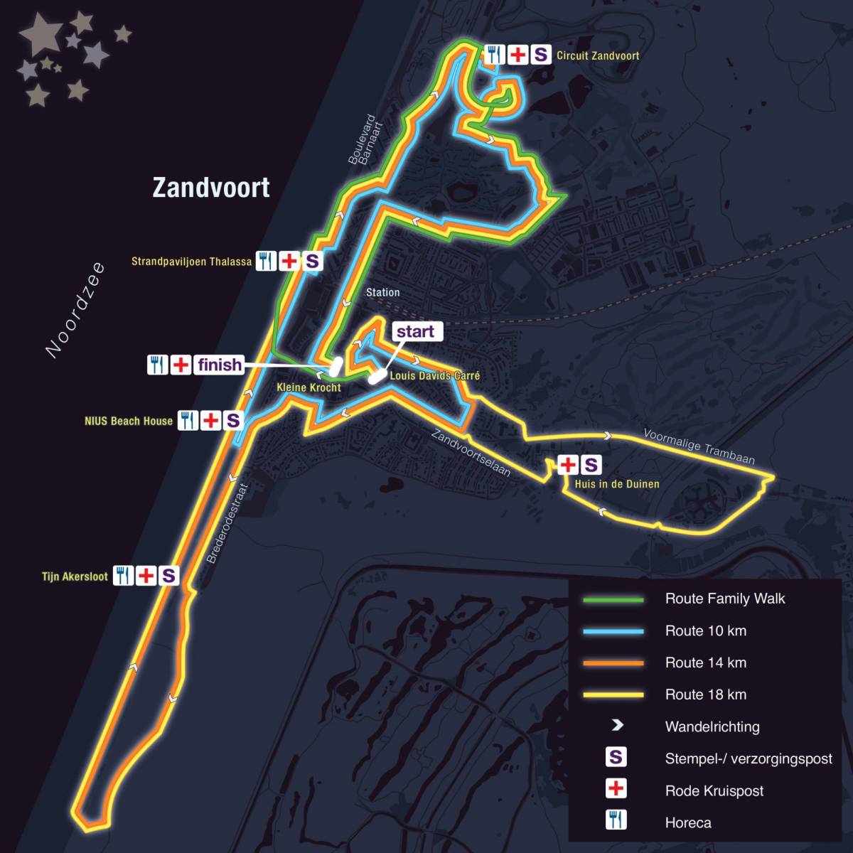 | Louis Davids Carré Louis Davidsstraat Raadhuisplein Kerkplein Kerkstraat Haltestraat Nieuwstraat Diaconiedwarsstraat Diaconiehuisstraat Van Ostadestraat Emmaweg Boulevard Paulus Loot Zuiderduinpad Strand Zuid P.N. Quarles van Uffordlaan Burgemeester Nawijnlaan Voormalige Trambaan Zandvoortselaan Haarlemmerstraat Brederodestraat | Paradijsweg Hogeweg Thorbeckestraat Strand Boulevard Barnaart Trompstraat Burgemeester van Alphenstraat Duintjesveldweg Van Pagéepad Heimansstraat Jacob Catsstraat Van Lennepweg Van Speijkstraat Stationsplein Ir. E.J.J. Kuindersstraat Stationsstraat Pakveldstraat Kruisstraat Gasthuisplein Raadhuisplein Kleine Krocht |